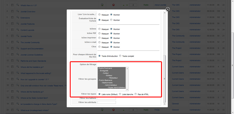 Pas de HTML supprime toutes les balises lorsque l'article est sauvegardé. Attention: ces réglages sont prioritaires sur ceux effectués dans les éditeurs WYSIWYG.
