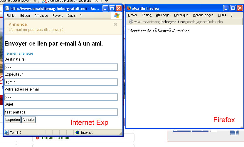Il s'agit d'un problème avec le composant mailto de joomla 3, l'icone "e-mail" est bien affiché sur mes articles, la fenêtre d'envoi s'ouvre, mais que je sois connectée ou non il me met "identifiant de sécurité invalide".