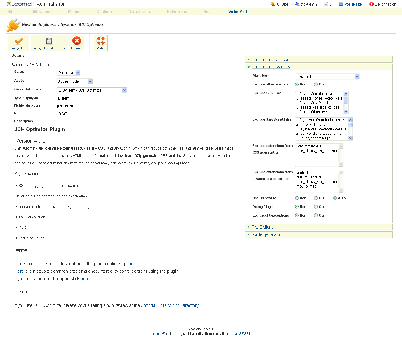 je souhaite installer le plugin jch_optimize afin d'accélérer l'affichage du site,