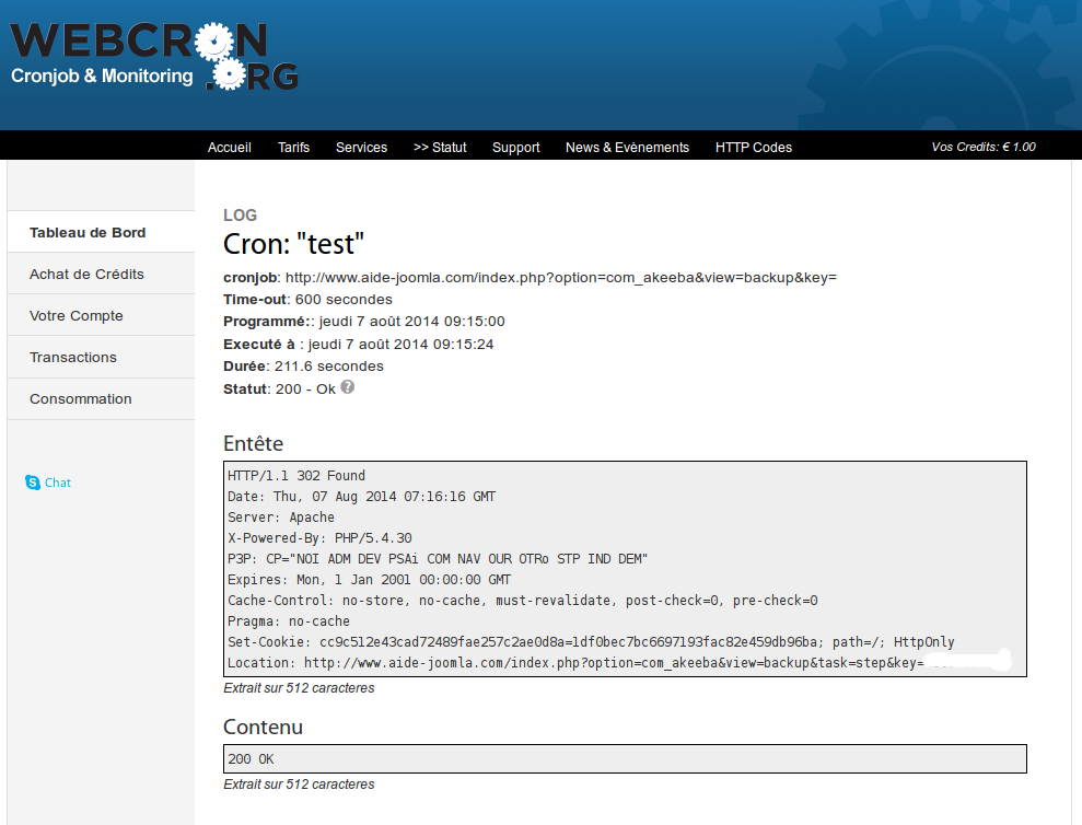 Le test du webcron est ok, c'est plutôt du côté d'Akeeba que j'ai des soupçons, en effet Akeeba m'indique une sauvegarde à 23h10, hors la sauvegarde coté cron est configuré à 1h10 du matin, étrange car le serveur est réglé sur le fuseau horaire de ma ville autant côté site Joomla que côté cron.