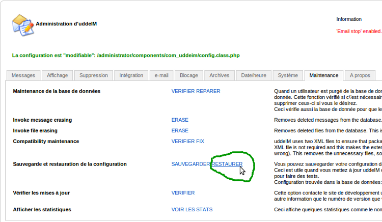 - Votre configuration UddelM en utilisant la fonction de sauvegarde de UddelM (Panneau administration de UddelM - Onglet "Maintenance", puis cliquez sur "SAUVEGARDER") ou alors en copiant simplement le fichier config.class.php qui se trouve dans le répertoire : /mon_site/administrator/components/com_uddeim/